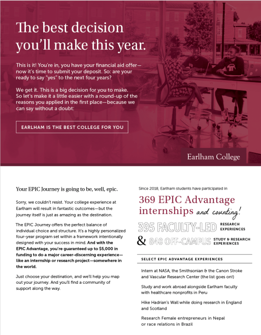 This front-and-back one-sheeter was included in students’ financial aid packages as a way to remind them of all the reasons they should choose Earlham.