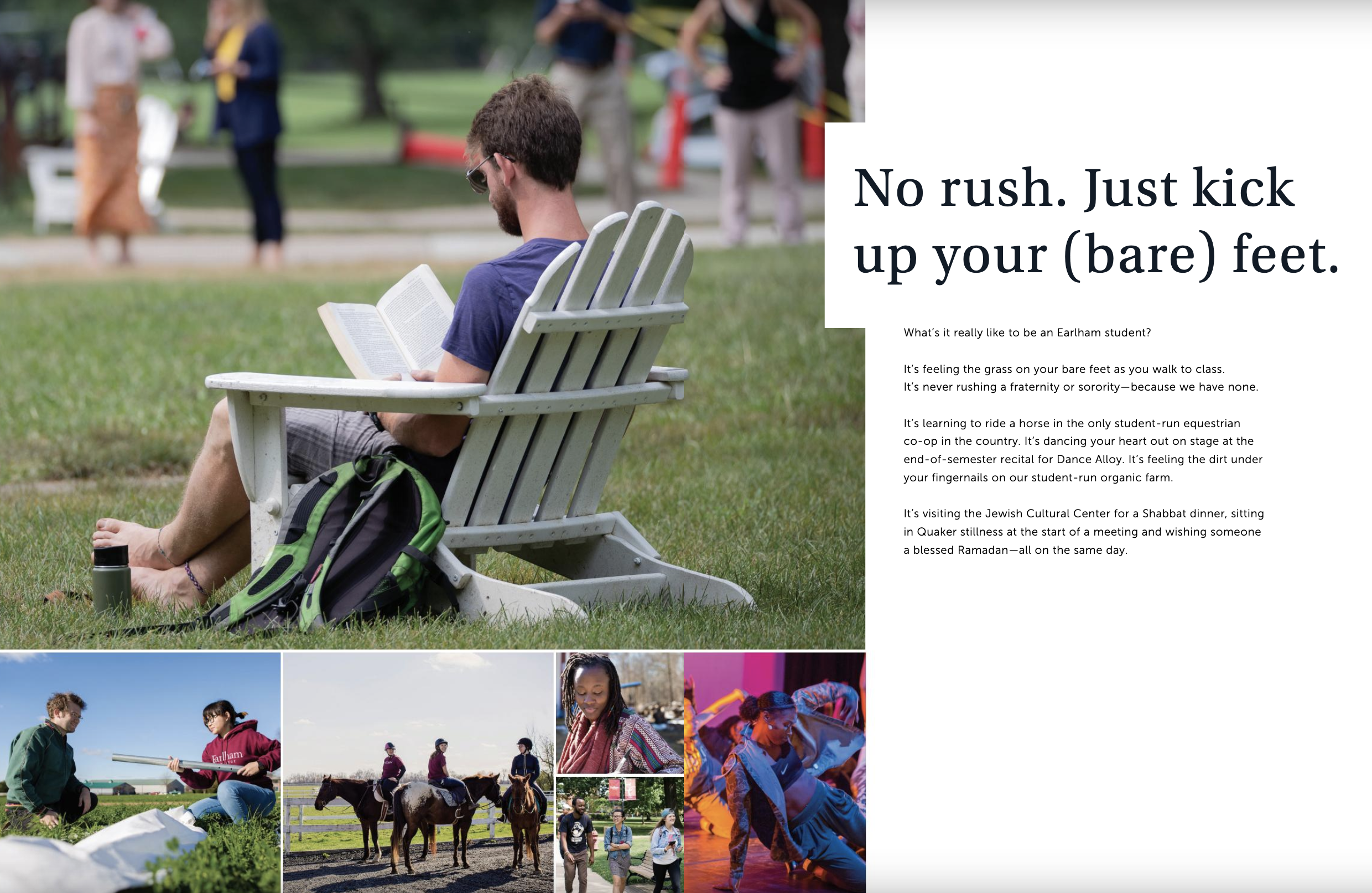“Earlham’s viewbook was clean, clear, consistent, and engaging. Through photography and voice, the piece highlighted all the aspects of being a student at Earlham—from academics to alumni network to opportunities to student life. We thought the copy was friendly and inviting and that this piece, in particular, highlighted an excellent use of in-house talent.”