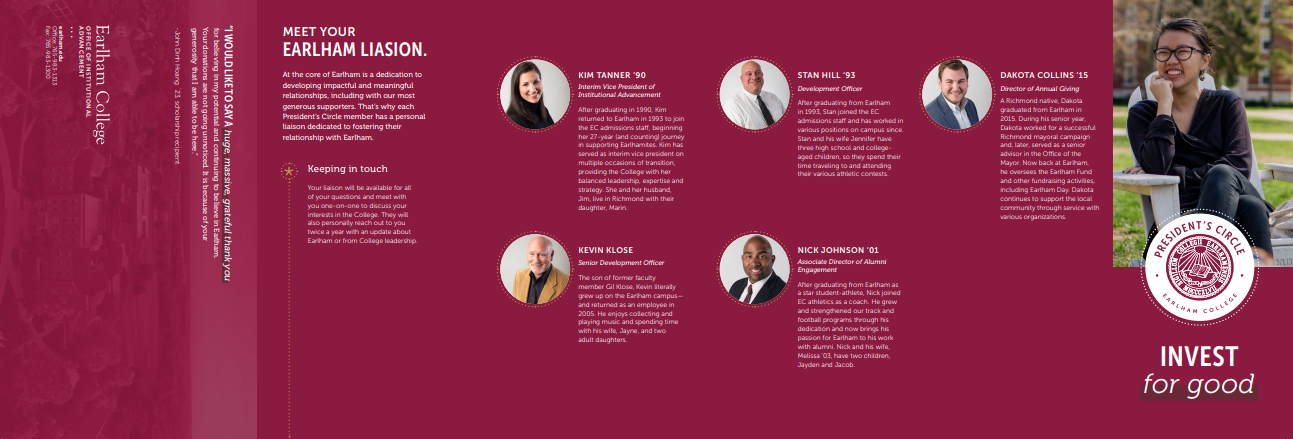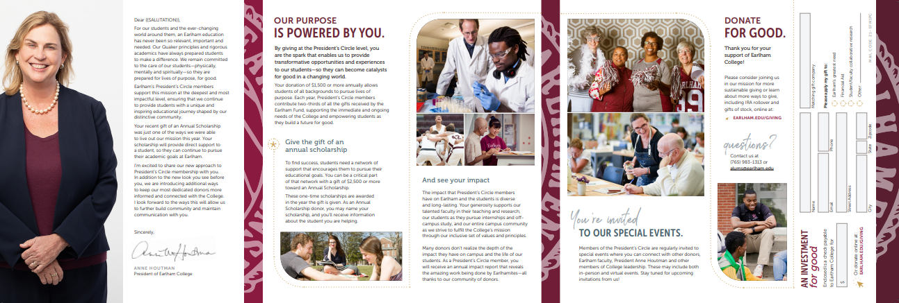 Fundraising is a critical function of many nonprofits. For this fundraising campaign mailer, the target audience included high-level donors and potential donors to the college. Our aim was to inform them about the benefits of belonging to the College’s highest tier of donors, and to encourage continued donations at that level.