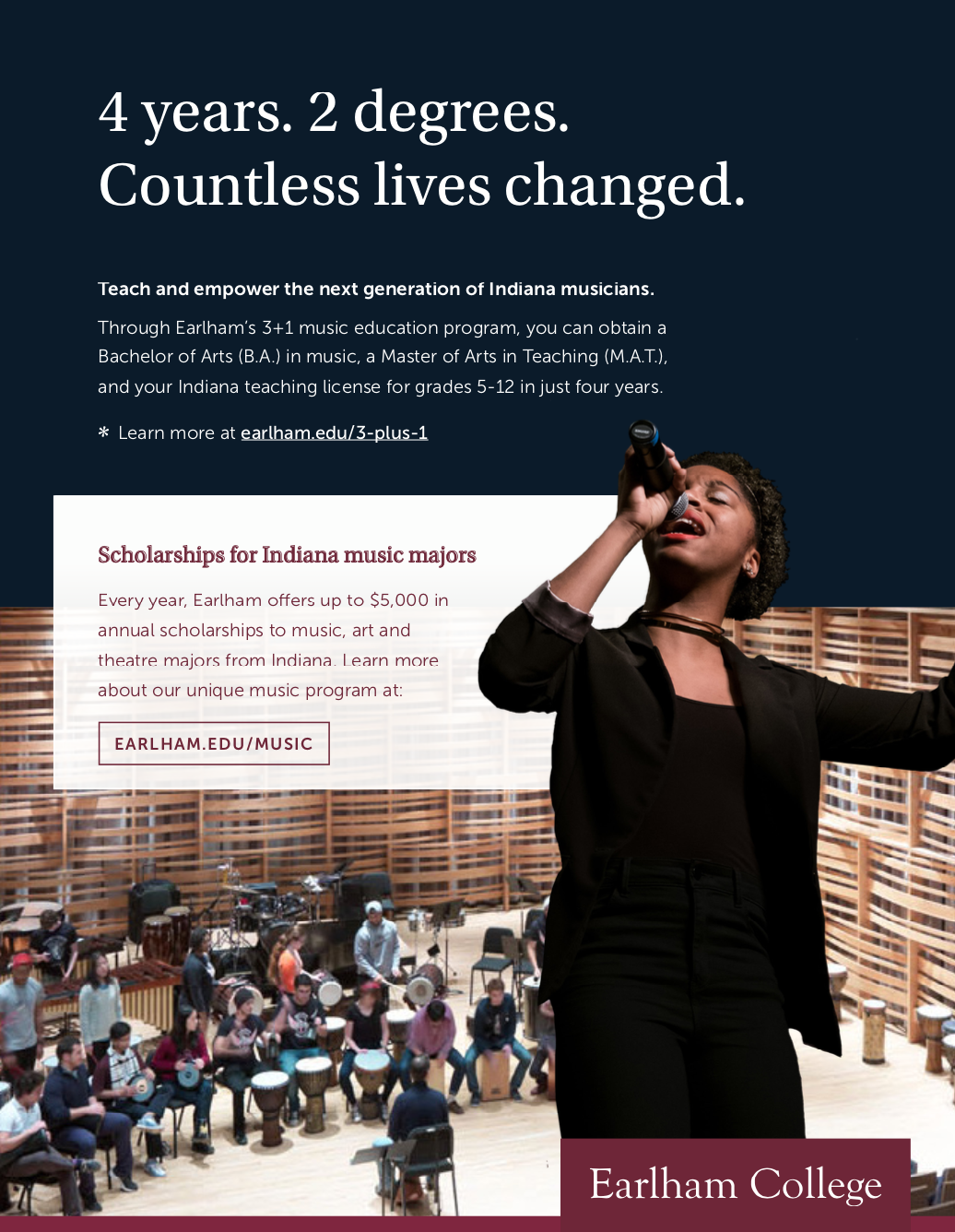 Because the program would already be full of ads from other Indiana higher ed music programs, I focused the ad’s copy on the most compelling benefits Earlham’s music program can offer: the option to complete two degrees in four years, and the scholarships available to these specific students.