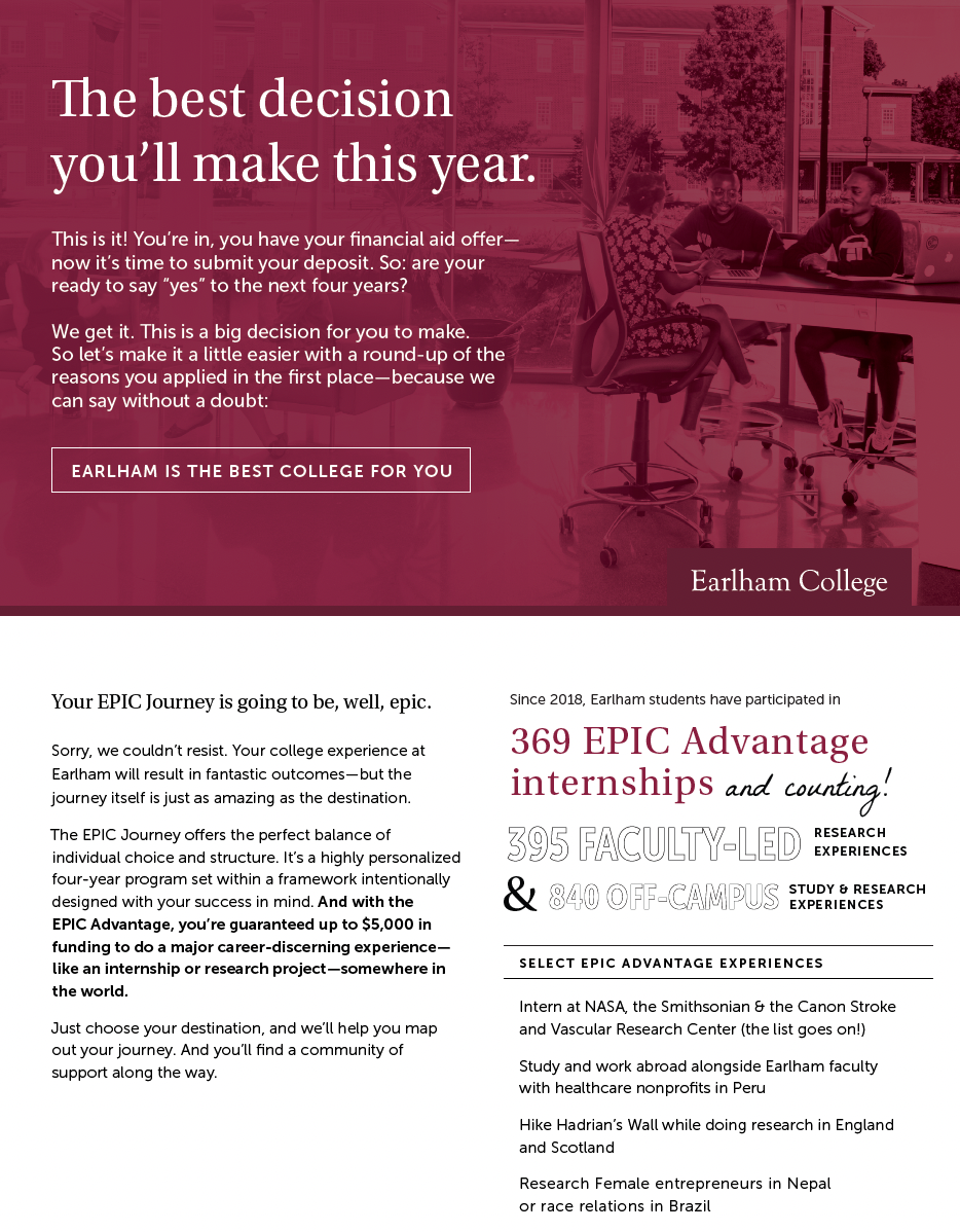 This front-and-back one-sheeter was included in students’ financial aid packages. It’s essentially a sales letter, meant to “close the deal” and encourage admitted students to choose Earlham. Click to view the full document.